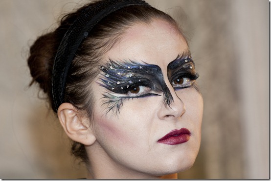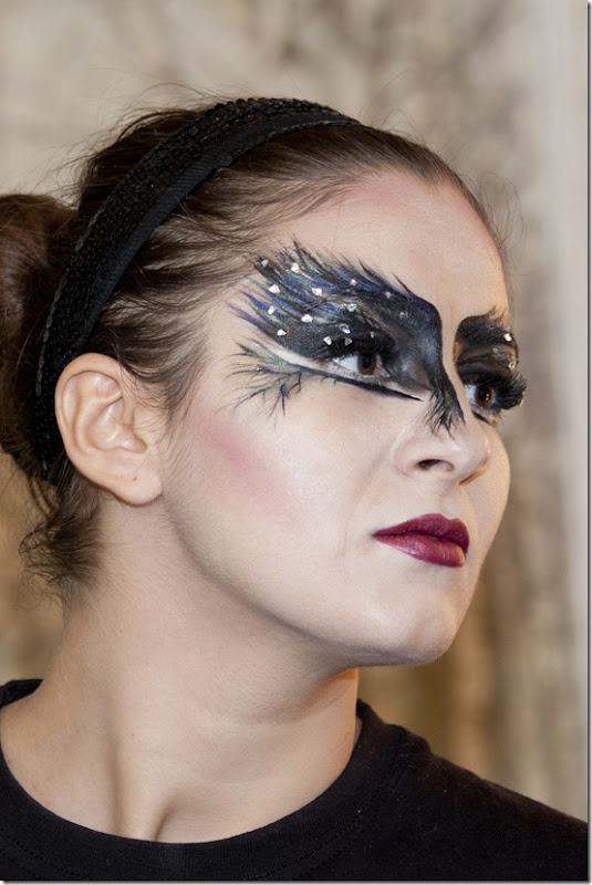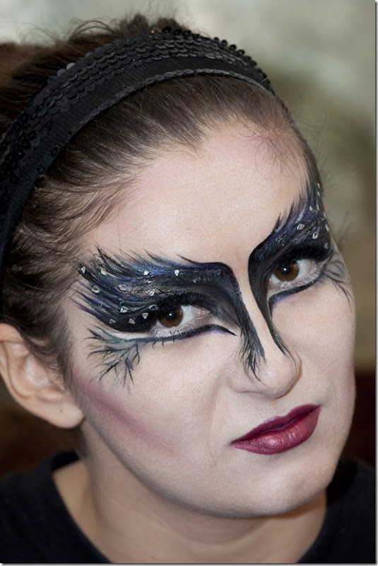 Cele care ne urmariti pagina de facebook probabil ati observat ca zilele trecute am postat o poza cu prietena noastra Edith costumata in Black Swan. Machiajul ei l-am facut toate, fiecare a contribuit cu ceva :)) Edith si-a aplicat baza si si a facut un contur modelului si si-a aplicat rujul pe buze, eu i-am facut modelul cu tus negru si Aetana i-a aplicat paietele. Munca in echipa, ce naiba :))
